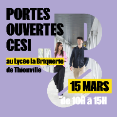 CESI organise le Samedi 15 mars 2025, de 10h à 15h, une Journée Portes Ouvertes sur son campus de Thionville, au Lycée La Briquerie !
