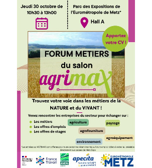 Les entrées pour AGRIMAX sont offertes pour toute personne venant au FORUM Métiers, tickets à retirer au préalable directement aux caisses de Metz Expo.