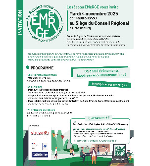 - 17h : Plénière de clôtureRemise des trophées «coups de coeur» 2025 du Grand Est et cocktail.---EMeRGE conseille et accompagne les organisateurs d'événements dans une démarche de développement durable.En savoir + : www.emer-ge.fr