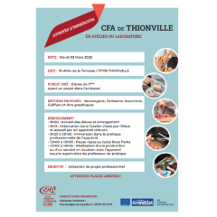 Si vous êtes collégiens et que vous avez un projet dans l'Artisanat, cette journée en doublon avec un apprenti du Campus des Métiers de la Moselle vous permettra de pratiquer en laboratoire/atelier et de valider votre projet professionnel.