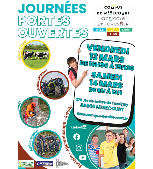 Le Campus de Mirecourt Agricole et Forestier organise ses portes ouvertes dans les locaux du lycée le vendredi 13 mars de 16h30 à 19h30 et samedi 14 mars de 9h à 13h.