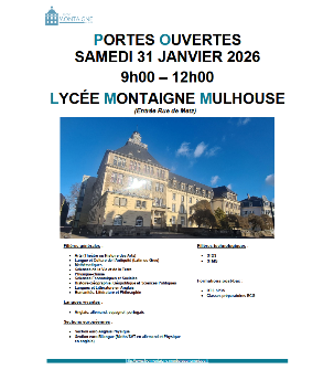 Le Lycée Montaigne à Mulhouse vous convie à ses portes ouvertes le samedi 31 janvier 2026 de 9h à 12h.