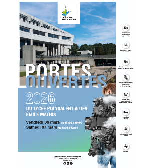 Le lycée et UFA Emile Mathis a le plaisir de vous accueillir dans le cadre des Journées Portes organisées le 6 mars 2026 de 15h à 19h, et le 7 mars 2026 de 8h30 à 12h.