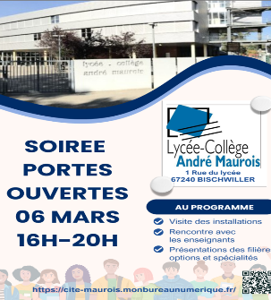 Venez découvrir le Lycée André Maurois de Bischwiller le vendredi 6 mars 2026 lors de ses portes ouvertes.