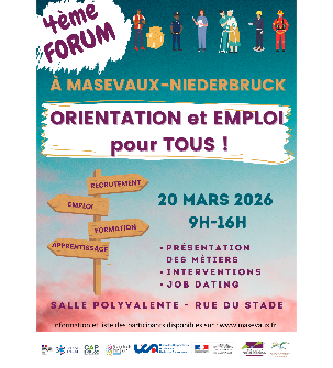La Ville de Masevaux-Niederbruck, en partenariat avec la Communauté de Communes de la Vallée de la Doller et du Soultzbach, organise la 4e édition du Forum de l’Orientation et de l’Emploi pour Tous, qui se tiendra le vendredi 20 mars 2026.