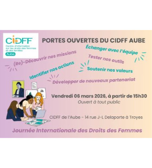 Dans le cadre de la Journée Internationale des Droits des Femmes, le CIDFF, Centre d'Information sur les droits des femmes et des familles, vous ouvre ses portes pour :